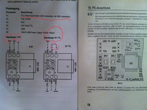 Also nun nocheinmal von vorne... :-) ich werde Schritt für Schritt euren Anweisungen folgen. Zuerst einmal der Einbau der USB Schnittstelle. Ist dies gemäss Foto richtig? In der Anleitung steht was von TTL Dirver. Brauche ich den? Ich möchte einfach das Programm nach meinen Wünschen per USB gestalten können. Dann die frage; muss ich eine Brücke löten? Die Fakten: - Habe die LED Steuerung mit einem 3S Lipo (3x3.7V) eingespiesen. - Die Abgänge gehen auf Relais die dann die LED's schalten. - Ebenso ist die Steuerung am Empfänger angeschlossen. Die Programme lassen sich einwandfrei umschalten. - Bis dahin funktioniert alles bestens. IMG_0640.JPG: IMG_0643.JPG: | |