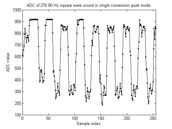 > Hello Pepe, > > of course I would like to know more about. The Free-Running-Mode > has the disadvantage that we must poll over the interrupt flank, > because there is no way to define a real interrupt routine. > That causes a lot of cpu-noise. Maybe we put the cpu into > ADC-Sleep-Mode and wait for the result. In ADC-Sleep-Mode we can > use a faster ADC-Clock. Please take a look at the program below. > > DancingProBot-0.01 > > GruÃ? Torsten Hi Torsten, Im am afraid the other running modes you programmed do not work so well as the free running mode. - ADCaptureRun runs 15% slower than ADCaptureRunFree and shows some glitches. - ADCaptureRunQuiet shows strange behaviour. See attached figures. What do you think? What might work is an 'ADCaptureRunFreeQuiet'. Regards, Pepe Sound data in single conversion mode.JPG: Sound data in single conversion quiet mode.JPG: | ||