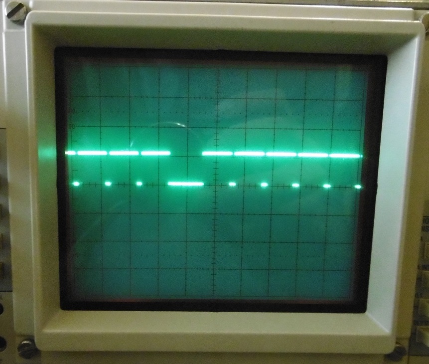 Ich versuche, diese Tesla-Spule mit der C-Control über den externen Eingang anzusteuern. Liegt am Eingang eine positive Spannung an ist die Spule deaktiviert. Liegt der Eingang auf Masse, dann schwingt die Spule. Das Problem dabei ist, dass die Spule nicht für den kontinuierlichen Betrieb ausgelegt ist. Das hei�t, man darf den Eingang nur kurz auf Masse ziehen (wenige Millisekunden) und muss die Spule dann wieder einige Millisekunden ausschalten, damit die Elektronik nicht überlastet wird. Ich verwende ein Poti am ADC 0 und PWM an Timer 1. In einer Endlosschleife wird Timer_T1PWM aufgerufen. Vereinfacht sieht das so aus: ADC_Set(ADC_VREF_VCC, 0) Do While True Timer_T1PWM(0x610, EinPaarBerechnungen(ADC_Read()), PS_64) 'Für PW0 z.B. 0x54E Thread_Delay(6) End While Tatsächlich wird da noch geprüft, ob ein Taster gedrückt ist und Timer_T1PWM wird auch nur dann aufgerufen, wenn sich der gemessene Wert verändert hat, aber um das Problem zu zeigen ist es sinnvoll, wenn Timer_T1PWM ständig aufgerufen wird. Das Problem ist jetzt folgendes: Immer dann, wenn Timer_T1PWM aufgerufen wird, wird der Timer ganz kurz pausiert. Der Pin verweilt dann für kurze Zeit in einem Zustand, und das kann auch logisch 0 sein. Ich habe das am Oszilloskop gemessen und ein Foto davon angehängt. Es darf nicht passieren, dass der Pin für längere Zeit auf logisch 0 bleibt. Ich suche eine Möglichkeit, den Ausgang auf logisch 1 zu fixieren, während der Timer noch läuft. Einfach vorher Port_WriteBit(PinB5, 1) und nachher Port_WriteBit(PinB5, 0) aufzurufen scheint keine Veränderung zu bewirken. P1010418 - Kopie.JPG: | ||