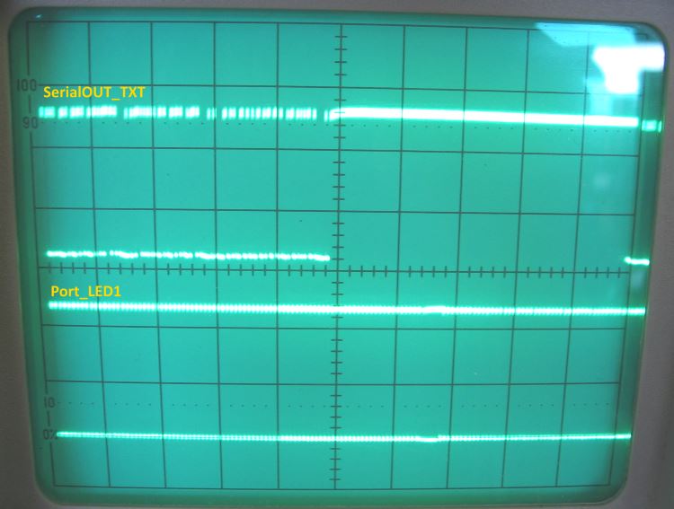 > > > > Hallo Torsten, > > > > das Programm bringt im Prinzip nichts. Ich will ja nicht nur 2 Strings timerverzögert > > ausgeben, sondern eine Vielzahl von Ausgaben in mehreren Funktionen machen. > > > > Wie es scheint muss die Ausgabe eines Strings erst beendet sein, bevor der nächste > > ausgegeben wird. Dazu müsste ich wissen, wann die Ausgabe abgeschlossen ist. > > Mich würd auch interessieren, ob während der seriellen Ausgabe das Hauptprogramm weiter > > abgearbeitet wird oder in der Zeit still steht. Im Manual steht dazu herzlich wenig. > > > > > Hallo Hannes, > > im sogenannten "Interruptbetrieb" läuft das Hauptprogramm parallel > zur seriellen Ausgabe weiter. Die Funktion "Serial_WriteText(0, gac_text_2);" > kehrt sofort wieder zurück. Du musst deine Aufrufe synchronisieren. > Eine Lösung für die Umsetzung sollte das obige Programm zeigen. > > Gru� Torsten Du hast recht, während der Datenausgabe (alle 10ms in RTC) läuft das Hauptprogramm (Port_ToggleBit(30))ungestört weiter. Sowas könnte man ins Manual schreiben ! // Testprogramm #define LED1_Ein Port_WriteBit(30,1) // Port D.6 #define LED1_Aus Port_WriteBit(30,0) byte buffer[SERIAL_BUF(20,30)]; byte Stunde,Minute,Sekunde,cnt1_10ms,cnt2_10ms,n; word counter; char text1[30]; void main(void) { text1= "Hallo Welt 012345 "; Port_DataDirBit(30,1); // Port D.6 auf Ausgang = LED1 Serial_Init_IRQ(0,buffer,20,30,SR_8BIT|SR_1STOP|SR_NO_PAR,SR_BD38400); Irq_SetVect(INT_TIM2COMP,INT_10ms); // ISR RTC while(1) { Port_ToggleBit(30); // LED1 EIN-AUS } } //--------------------------------- Interrupt alle 10ms ---------------------------------- // void INT_10ms(void) { int irqcnt; RTC(); // Funktionsaufrauf: RTC irqcnt=Irq_GetCount(INT_TIM2COMP); // Interrupt Request Counter } //-------------------------------------- Real-Time-Clock --------------------------------- // void RTC(void) // Aufruf alle 10ms { Serial_WriteText(0,text1); // String seriell ausgeben; Dauer ca. 5ms cnt1_10ms++; cnt2_10ms++; if (cnt1_10ms==100) // jede Sekunde { Sekunde++; if (Sekunde==60) // jede Minute { Sekunde=0; Minute++; if (Minute==60) // jede Stunde { Minute=0; Stunde++; if (Stunde==24) Stunde=0; } } cnt1_10ms=0; } } SerialOUT.JPG: | |