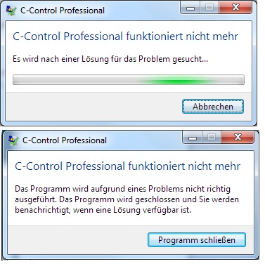 Hallo Peter, Ich habe Win 7 Prof 64x. Ein Baustein bei mir hat 1389 Zeilen. Wenn ich jetzt das Projekt kompiliere und noch Fehler im Projekt habe, dann meldet sich Windows mit folgendem Fehler. C-Control Professonl funktioniert nicht mehr. Gruss Christian C-Control Professional funktioniert nicht mehr.jpg: ![]() | ||