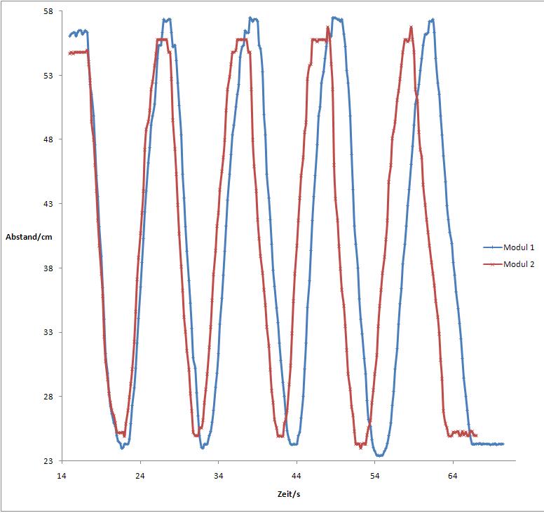 Grü� euch, ich hab zwei Pro Mega128, welche jeweils auf einem Projectboard 128 aufgebaut sind. An beiden Projectsboards sind jeweils die gleichen Baueinheiten angelötet: -jeweils DCF -Empfänger -jeweils CD-Card Interface -jeweils ein Sharp Analog-Distanzsenor mit Filterschaltung Beide Projectboards werden von der gleichen Spannungsquelle versorgt. Auf beiden Mikrocontrollern wurde exakt das gleiche Programm hochgeladen. Das Programm beinhaltet, dass der Mikrocontroller alle 200ms einen Spannungswert des Sensor durch die AD-Wandlung aufnimmt und diesen mit einem Zeitstempel (durch DCF) versieht Beide Mikrocontroller starten exakt zur selben Zeit mit der Distanzmessung ,nämlich genau dann, wenn sie die korrekte Uhrzeit durch das DCF Signal empfangen. Die empfangenen Uhrzeitdaten werden der internen RealTimeClock bereitgestellt und diese wird dann als Quelle für den Zeitstempel der Messdaten verwendet. Nun geschieht folgendes: eines der beiden Messmodule zählt die Zeit schneller bzw. langsamer als das andere Messmodul. Woran kann das liegen? Im Anhang befindet sich ein Diagramm einer Abstandsmessung, bei der dieses Problem gut dargestellt wird. Diagramm.JPG: | ||